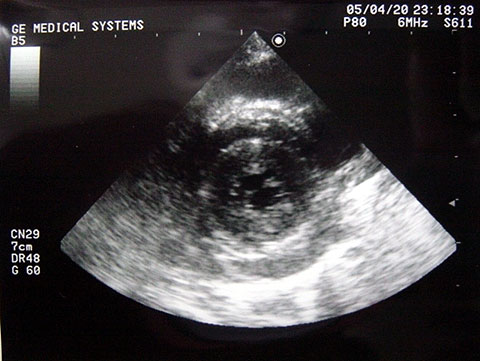 そこでレントゲン検査を実施しましたが、レントゲン上では異常を確認できないため、エコー(超音波画像診断)検査を行いました。エコー検査により肥大型心筋症と診断しました。